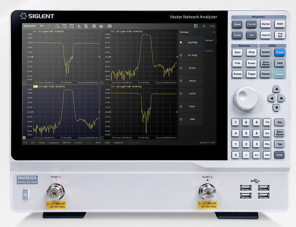 除開外觀設(shè)計,其先進的用戶界面,配合上12.1英寸超大觸摸屏與外接的鼠標(biāo)和鍵盤,讓工程師能更快的添加或刪除窗口,通道和跡線。SNA5000A支持在多個窗口下,添加多條跡線進行S參數(shù)測量。并且測量結(jié)果,可以多種數(shù)據(jù)格式顯示,如 Log Mag,Lin Mag,Phase,Delay,Smith,SWR,Polar等,可以方便快捷地分析被測物的傳輸系數(shù),反射系數(shù),駐波比,阻抗匹配,相位,延時等參數(shù)。